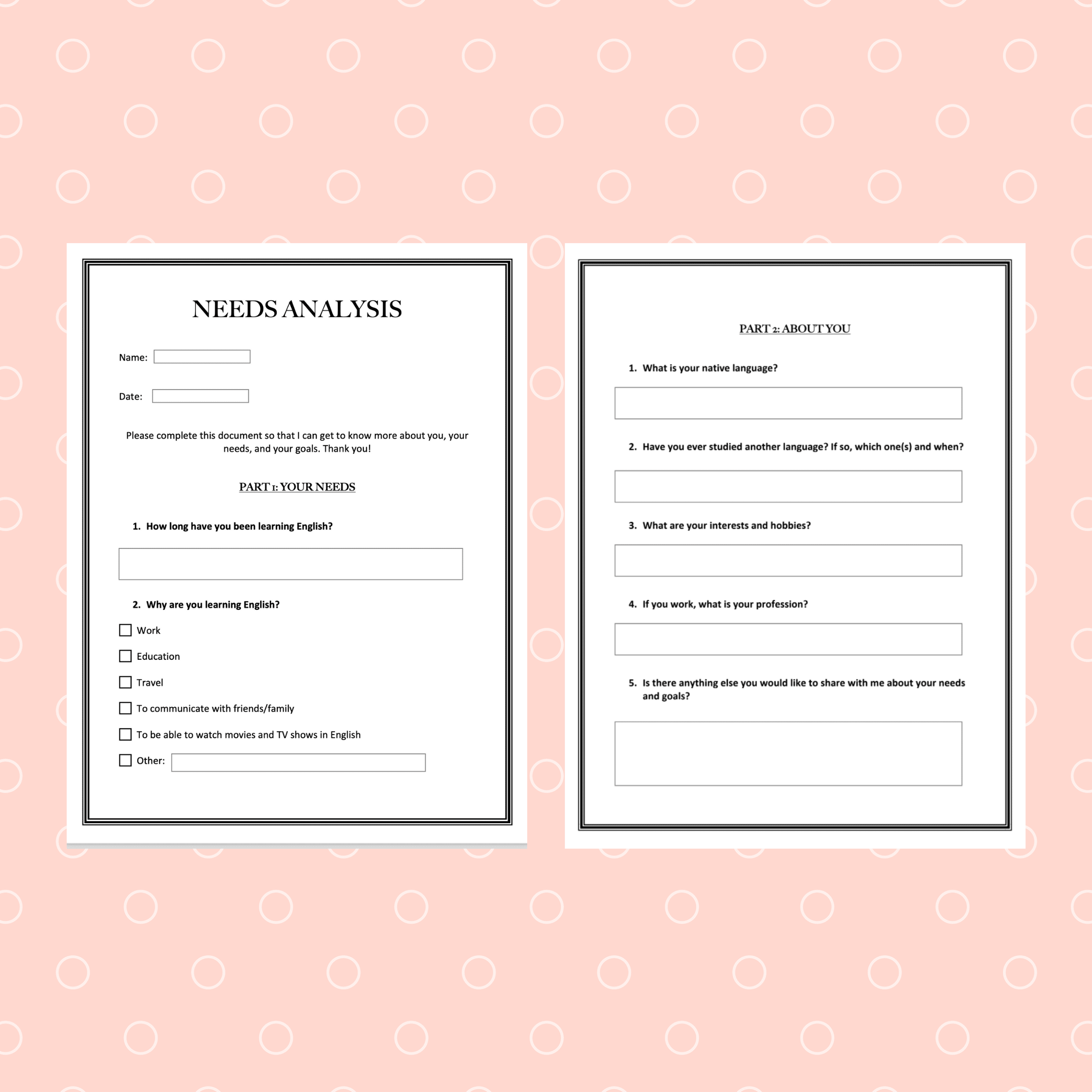 If you're an independent ESL teacher, a needs analysis is absolutely essential to set the tone for the lessons ahead and ensure that the student's needs are met. This needs analysis template has everything you need to assess your ESL student's needs, interests, and language-learning goals.